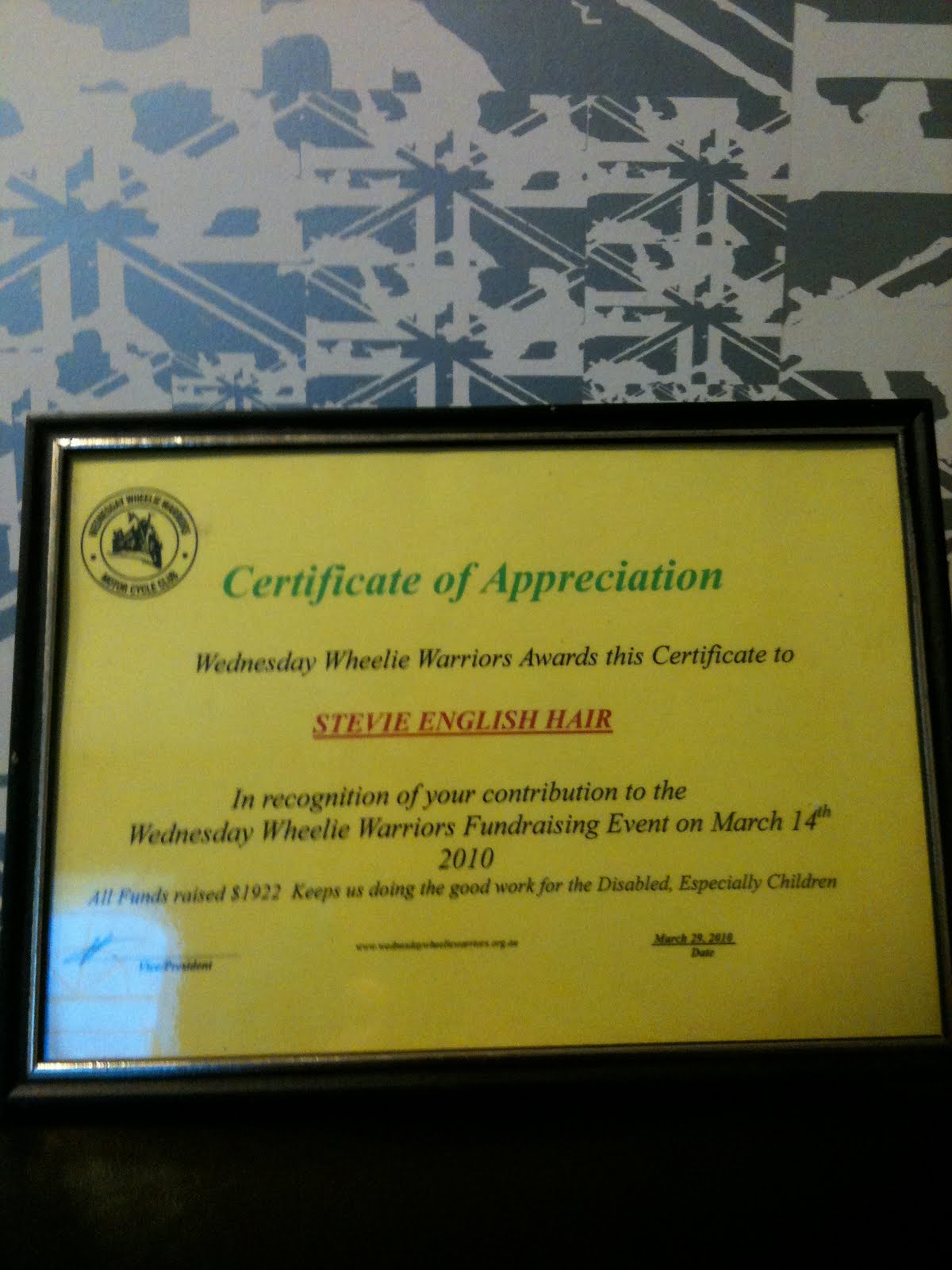 We try to help our local community whenver possible. We often offer free haircuts to the local schools as raffle prizes, and another charity we like to promote is the Wheelie Warriors. It's a group who offer motorbike rides to kids in wheel chairs, they are awesome and it's great for the kids.